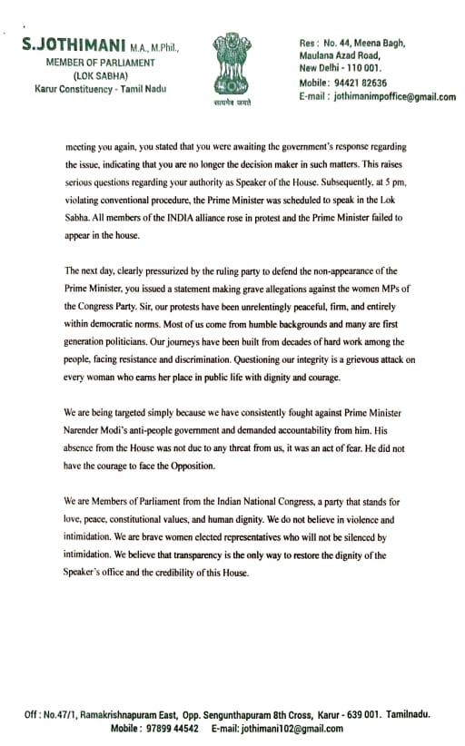 पत्र के अंत में कांग्रेस की महिला सांसदों ने स्पष्ट किया कि वे डराने या दबाने से चुप रहने वाली नहीं हैं। उन्होंने दोहराया कि कांग्रेस पार्टी प्रेम, शांति, संवैधानिक मूल्यों और मानव गरिमा में विश्वास करती है। महिला सांसदों ने कहा कि पारदर्शिता और निष्पक्षता ही लोकसभा अध्यक्ष के पद और संसद की विश्वसनीयता को बहाल करने का एकमात्र रास्ता है।।