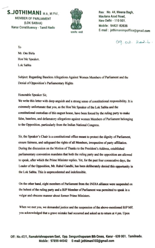 New Delhi News (09 February 2026): कांग्रेस पार्टी की महिला सांसदों ने लोकसभा अध्यक्ष ओम बिरला को एक संयुक्त पत्र लिखकर सदन की कार्यप्रणाली और विपक्ष के अधिकारों को लेकर गंभीर सवाल खड़े किए हैं। पत्र में महिला सांसदों के खिलाफ लगाए गए “निराधार, झूठे और मानहानिकारक आरोपों” पर गहरी पीड़ा जताई गई है। साथ ही इसे लोकतांत्रिक मूल्यों और संसदीय परंपराओं के विरुद्ध बताया गया है।