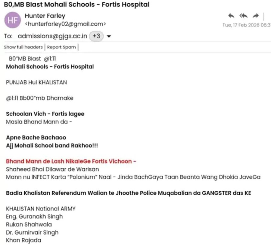 Punjab News (17 February 2026): पंजाब के मुख्यमंत्री भगवंत मान को लेकर एक सनसनीखेज धमकी भरा ईमेल सामने आया है। जानकारी के मुताबिक, मोहाली स्थित Fortis Hospital Mohali को बम से उड़ाने की धमकी दी गई है। बताया जा रहा है कि मुख्यमंत्री इसी अस्पताल में भर्ती हैं, जिसके चलते सुरक्षा एजेंसियों में हड़कंप मच गया। ईमेल में न सिर्फ अस्पताल को निशाना बनाने की बात कही गई है, बल्कि मुख्यमंत्री को लेकर भी गंभीर और आपत्तिजनक दावे किए गए हैं। सूचना मिलते ही पुलिस और सुरक्षा एजेंसियां सक्रिय हो गईं और अस्पताल परिसर की सुरक्षा कड़ी कर दी गई।