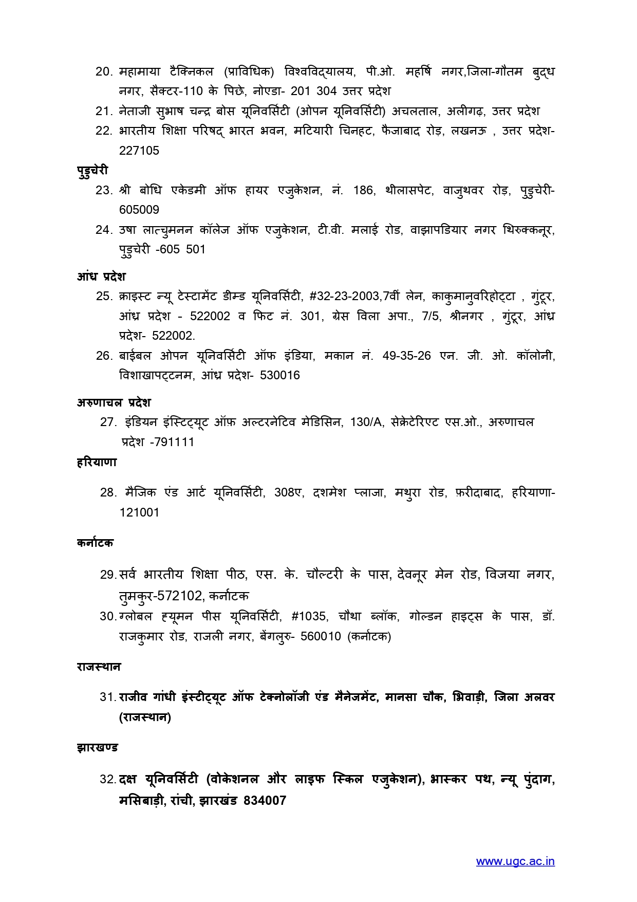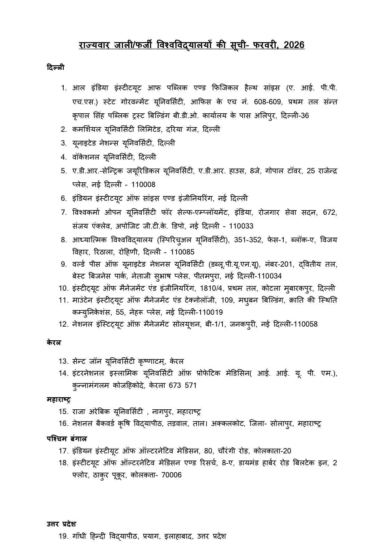 सूची में पुडुचेरी से दो और केरल, हरियाणा, राजस्थान, झारखंड तथा अरुणाचल प्रदेश से एक-एक संस्थान शामिल हैं। UGC ने छात्रों से अपील की है कि किसी भी विश्वविद्यालय में दाखिला लेने से पहले उसकी मान्यता की जांच अवश्य करें, ताकि भविष्य सुरक्षित रह सके।