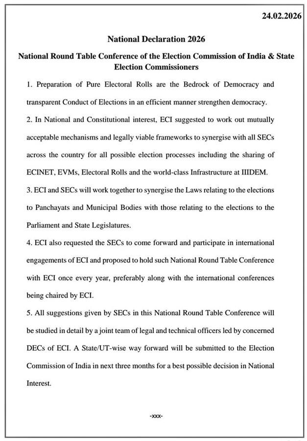सम्मेलन के दौरान जारी ‘नेशनल डिक्लेरेशन 2026’ में स्पष्ट किया गया कि शुद्ध मतदाता सूची लोकतंत्र की आधारशिला है और पारदर्शी एवं कुशल चुनाव संचालन से लोकतांत्रिक व्यवस्था मजबूत होती है। इसमें राष्ट्रीय और संवैधानिक हित को ध्यान में रखते हुए ECI और सभी राज्य चुनाव आयोगों (SECs) के बीच आपसी सहमति से कानूनी रूप से व्यवहार्य ढांचे विकसित करने पर जोर दिया गया। घोषणा में ECINET, EVMs, मतदाता सूची और IIIDEM के विश्वस्तरीय इंफ्रास्ट्रक्चर को साझा करने जैसे बिंदुओं को भी शामिल किया गया।