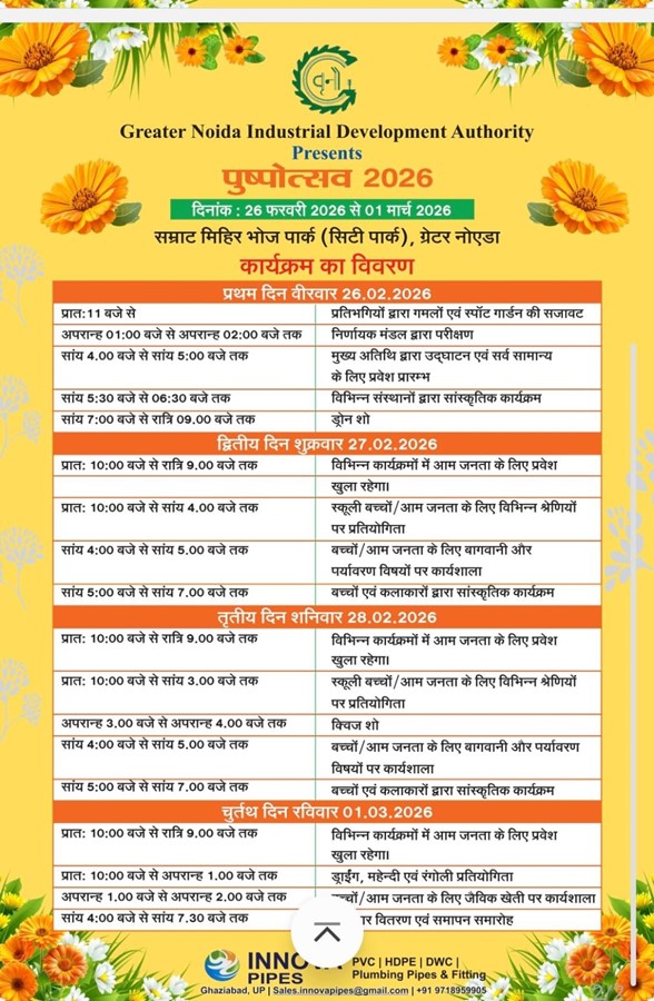 GREATER NOIDA News (26/02/2026): ग्रेटर नोएडा प्राधिकरण (Greater Noida Industrial Development Authority) के तत्वावधान में उद्यान विभाग द्वारा ‘द ग्रेटर नोएडा फ्लावर शो – पुष्पोत्सव 2026’ का भव्य आयोजन 26 फरवरी से 1 मार्च 2026 तक किया जा रहा है। इस वर्ष पुष्पोत्सव की थीम ‘कैलेंडुला फूल’ (Calendula Flower) रखी गई है। आयोजन स्थल ग्रेटर नोएडा का प्रमुख हरित क्षेत्र सम्राट मिहिर भोज सिटी पार्क होगा, जहां चार दिनों तक रंग-बिरंगे फूल, सांस्कृतिक प्रस्तुतियां और पर्यावरण से जुड़े कार्यक्रम आकर्षण का केंद्र रहेंगे।