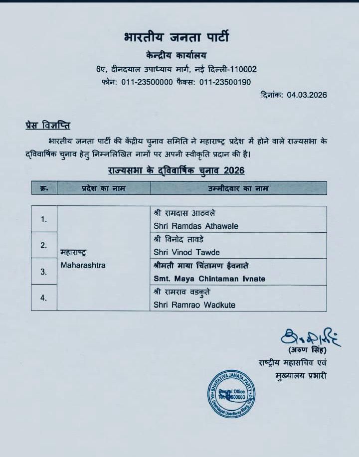 Maharstra News (04 March 2026): भारतीय जनता पार्टी (BJP) ने महाराष्ट्र से राज्यसभा चुनाव के लिए अपने चार उम्मीदवारों के नामों को मंजूरी दे दी है। पार्टी की केंद्रीय चुनाव समिति ने इन नामों पर अंतिम स्वीकृति दी, जिसकी आधिकारिक जानकारी 4 मार्च 2026 को जारी की गई। इस घोषणा के साथ ही महाराष्ट्र की राजनीतिक सरगर्मियां तेज हो गई हैं और राज्यसभा की सात खाली हो रही सीटों को लेकर रणनीतिक समीकरण स्पष्ट होने लगे हैं।