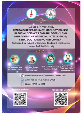 Greater Noida News (05/03/2026): ग्रेटर नोएडा स्थित गौतम बुद्ध विश्वविद्यालय में सामाजिक विज्ञान, दर्शन और आर्टिफिशियल इंटेलिजेंस के अंतर्संबंध पर केंद्रित दस दिवसीय शोध कार्यप्रणाली पाठ्यक्रम का आयोजन किया जा रहा है। यह पाठ्यक्रम 9 मार्च से 18 मार्च 2026 तक विश्वविद्यालय के स्कूल ऑफ बौद्ध स्टडीज एंड सिविलाइज़ेशन द्वारा आयोजित किया जाएगा। कार्यक्रम को भारतीय सामाजिक विज्ञान अनुसंधान परिषद (आईसीएसएसआर), नई दिल्ली का सहयोग प्राप्त है।