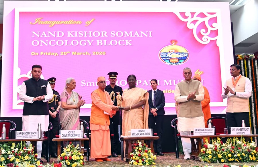 National News (20 मार्च 2026): राष्ट्रपति द्रौपदी मुर्मु ने आज (20 मार्च, 2026) उत्तर प्रदेश के वृन्दावन में रामकृष्ण मिशन सेवाश्रम में नंद किशोर सोमानी कैंसर चिकित्सा ब्लॉक का उद्घाटन किया।