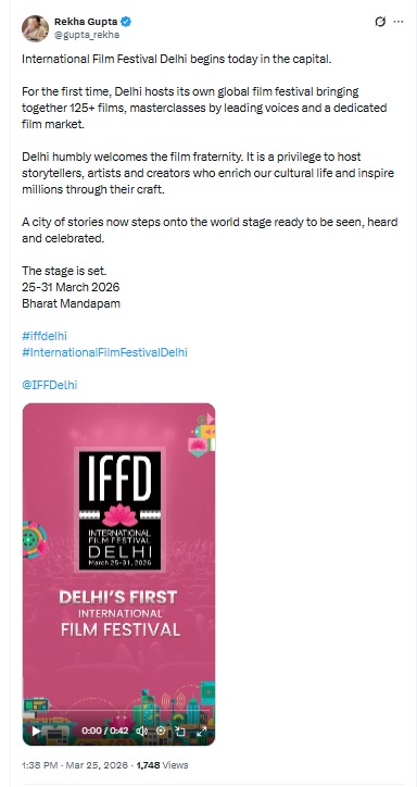 New Delhi News (25 March 2026): दिल्ली की मुख्यमंत्री रेखा गुप्ता ने ट्वीट कर राजधानी में इंटरनेशनल फिल्म फेस्टिवल की शुरुआत की घोषणा की है। 25 से 31 मार्च 2026 तक चलने वाला यह भव्य आयोजन पहली बार दिल्ली को एक अंतरराष्ट्रीय फिल्म मंच के रूप में स्थापित करेगा। इस प्रतिष्ठित कार्यक्रम का आयोजन भारत मंडपम में किया जा रहा है, जहां दुनियाभर के फिल्मकार और कलाकार एक साथ नजर आएंगे।