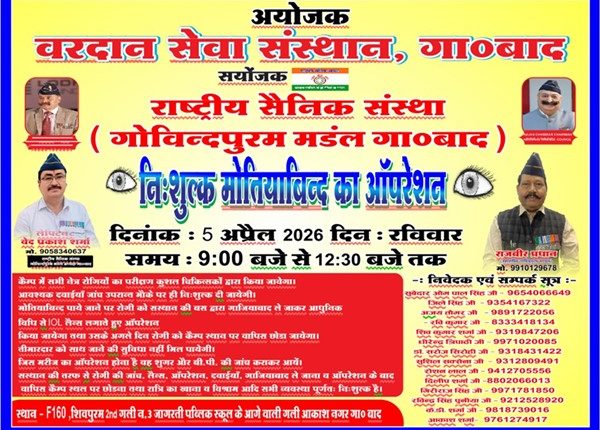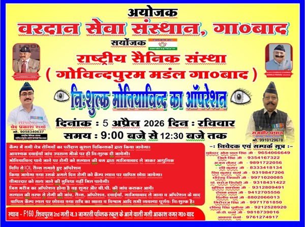 Ghaziabad News (01/04/2026): गोविंदपुरम क्षेत्र में 5 अप्रैल 2026 (रविवार) को नि:शुल्क नेत्र जांच शिविर का आयोजन किया जाएगा। इस शिविर में आंखों की जांच के साथ-साथ जरूरतमंद मरीजों के लिए मोतियाबिंद के ऑपरेशन की सुविधा भी उपलब्ध कराई जाएगी। कार्यक्रम का संचालन राष्ट्रीय सैनिक संस्था, गोविंदपुरम मंडल द्वारा किया जाएगा, जबकि इसका आयोजन वरदान सेवा संस्थान के सहयोग से किया जा रहा है।