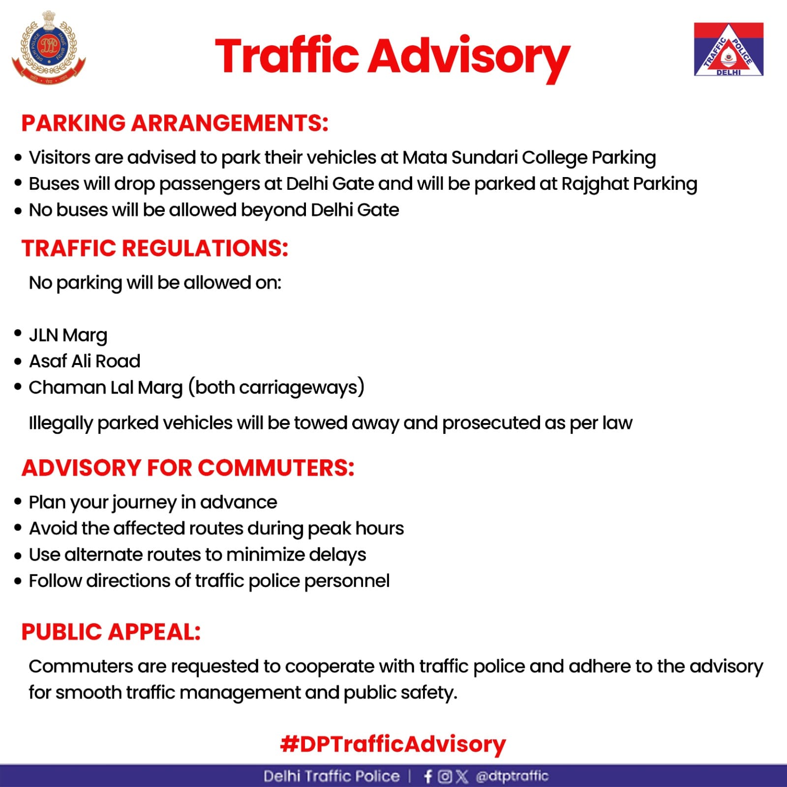 पार्किंग को लेकर भी विशेष व्यवस्था की गई है। आगंतुकों को माता सुंदरी कॉलेज की पार्किंग का उपयोग करने की सलाह दी गई है, जबकि बसों को केवल दिल्ली गेट तक ही आने की अनुमति होगी और उन्हें राजघाट के पास पार्क किया जाएगा। प्रभावित मार्गों पर नो-पार्किंग लागू रहेगी और नियमों का उल्लंघन करने वाले वाहनों को हटाया जाएगा।