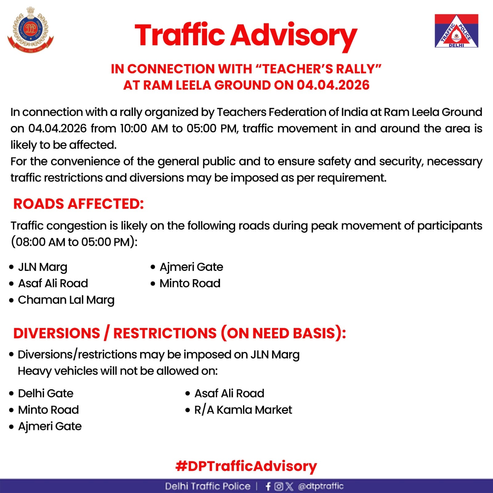 New Delhi News (03 April 2026): दिल्ली ट्रैफिक पुलिस ने 4 अप्रैल 2026 को होने वाली टीचर्स रैली को लेकर ट्रैफिक एडवाइजरी जारी की है। यह रैली रामलीला ग्राउंड में आयोजित की जाएगी, जिसके चलते आसपास के इलाकों में ट्रैफिक पर व्यापक असर पड़ने की संभावना है। पुलिस के अनुसार सुबह 8 बजे से शाम 5 बजे तक यातायात प्रभावित रह सकता है।