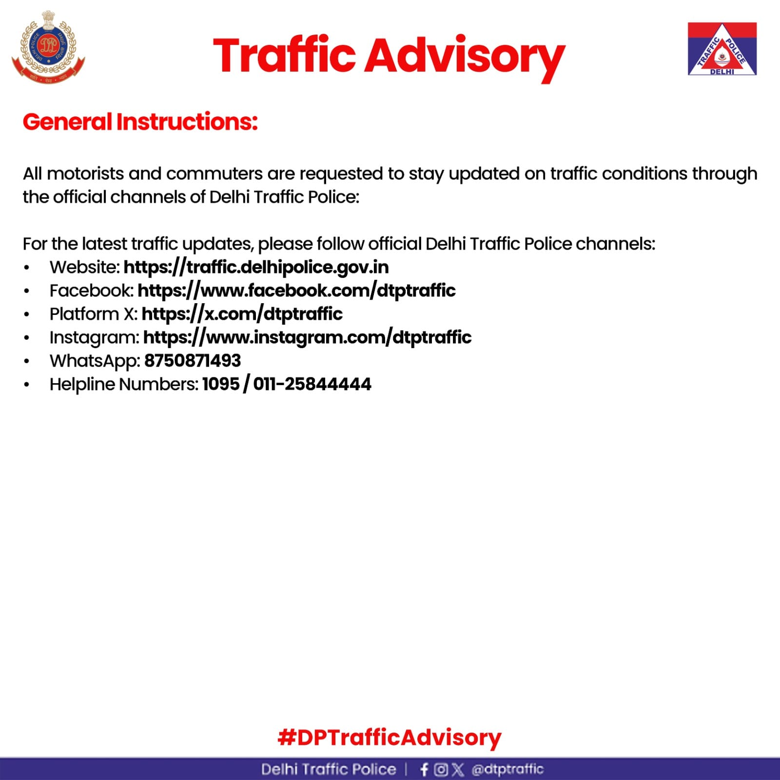 यात्रियों को सलाह दी गई है कि वे पहले से अपने सफर की योजना बनाएं, भीड़भाड़ वाले इलाकों से बचें और वैकल्पिक मार्गों का इस्तेमाल करें। साथ ही, मेट्रो और बस जैसी सार्वजनिक परिवहन सेवाओं का अधिक उपयोग करने की अपील की गई है, ताकि ट्रैफिक दबाव कम किया जा सके और यात्रा सुगम बनी रहे।
