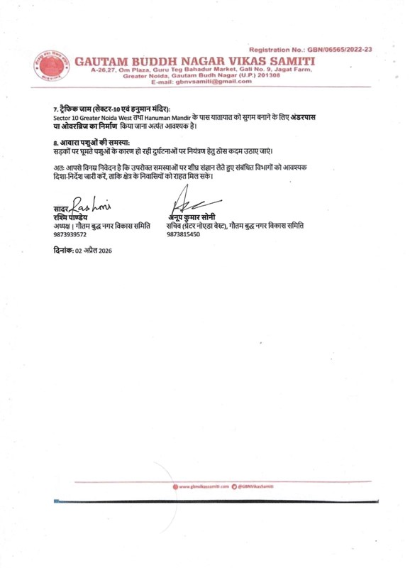 समिति के अनुसार, क्षेत्र में यातायात, पर्यावरण, स्वच्छता और बुनियादी ढांचे से जुड़ी कई समस्याएं हैं, जिनके समाधान से स्थानीय निवासियों को बड़ी राहत मिल सकती है। मांग पत्र में इन मुद्दों को विस्तार से उठाते हुए आवश्यक कार्रवाई का अनुरोध किया गया है।