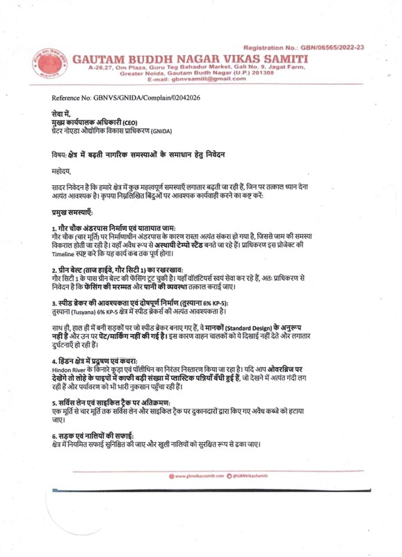 Greater Noida News (04/04/2026): ग्रेटर नोएडा वेस्ट क्षेत्र में बढ़ती नागरिक समस्याओं और बुनियादी सुविधाओं को बेहतर बनाने के उद्देश्य से गौतम बुद्ध नगर विकास समिति के पदाधिकारियों ने ग्रेटर नोएडा औद्योगिक विकास प्राधिकरण (GNIDA) को एक विस्तृत मांग पत्र भेजकर विभिन्न मुद्दों पर ध्यान आकर्षित किया है। समिति के प्रतिनिधिमंडल ने टेकजोन-4 स्थित प्राधिकरण कार्यालय पहुंचकर अधिकारियों से मुलाकात का प्रयास भी किया। प्रत्यक्ष मुलाकात संभव न होने पर समिति ने मुख्य कार्यपालक अधिकारी (CEO) के नाम ई-मेल के माध्यम से अपनी मांगें और सुझाव प्रेषित किए।