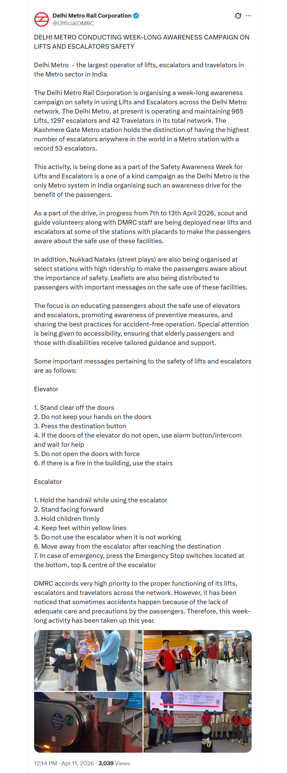 दिल्ली मेट्रो नेटवर्क में वर्तमान में 965 लिफ्ट, 1297 एस्केलेटर और 42 ट्रैवलैटर संचालित हो रहे हैं, जिनका रखरखाव और संचालन DMRC द्वारा किया जाता है। खास बात यह है कि कश्मीरी गेट मेट्रो स्टेशन दुनिया का ऐसा मेट्रो स्टेशन है, जहां सबसे अधिक 53 एस्केलेटर मौजूद हैं। इतने बड़े नेटवर्क में सुरक्षा बनाए रखना एक चुनौती है, इसलिए DMRC ने इस अभियान के जरिए यात्रियों को जागरूक करने की दिशा में अहम कदम उठाया है।