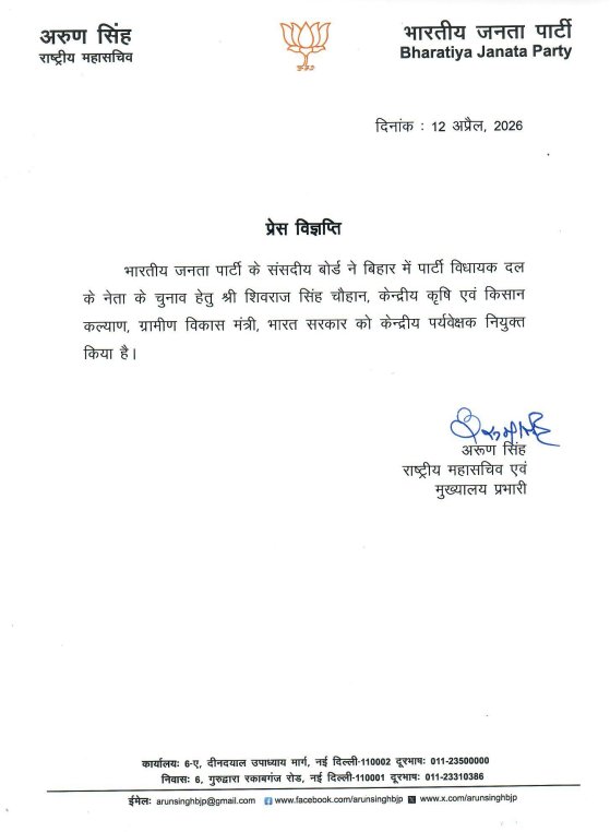 Bihar News (12 April 2026): बिहार के मुख्यमंत्री नीतीश कुमार ने राज्य सभा की सदस्यता ग्रहण कर ली है। ऐसे में बिहार में सीएम पद को लेकर तमाम कयास लगाए जा रहे है। इसी कड़ी में भारतीय जनता पार्टी ने बिहार की राजनीति में एक अहम कदम उठाते हुए विधायक दल के नेता के चुनाव के लिए केंद्रीय पर्यवेक्षक की नियुक्ति कर दी है। भारतीय जनता पार्टी के संसदीय बोर्ड ने वरिष्ठ नेता एवं केंद्रीय मंत्री शिवराज सिंह चौहान को इस महत्वपूर्ण जिम्मेदारी के लिए चुना है। यह फैसला ऐसे समय में लिया गया है जब राज्य में पार्टी अपने संगठनात्मक ढांचे को मजबूत करने और नेतृत्व को स्पष्ट दिशा देने की तैयारी में है।