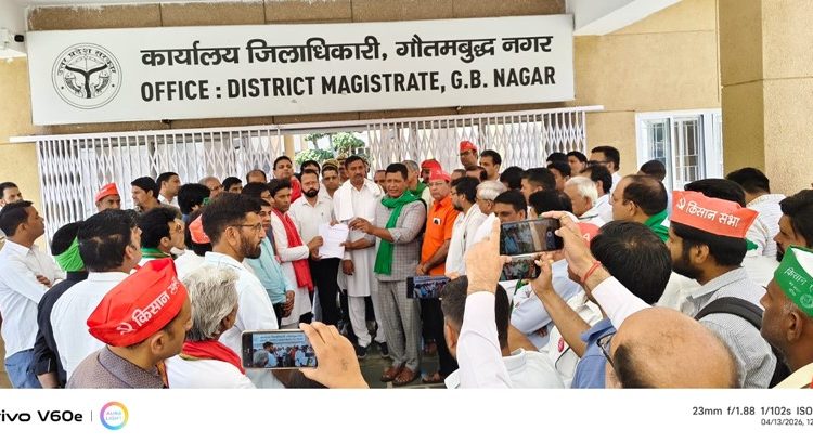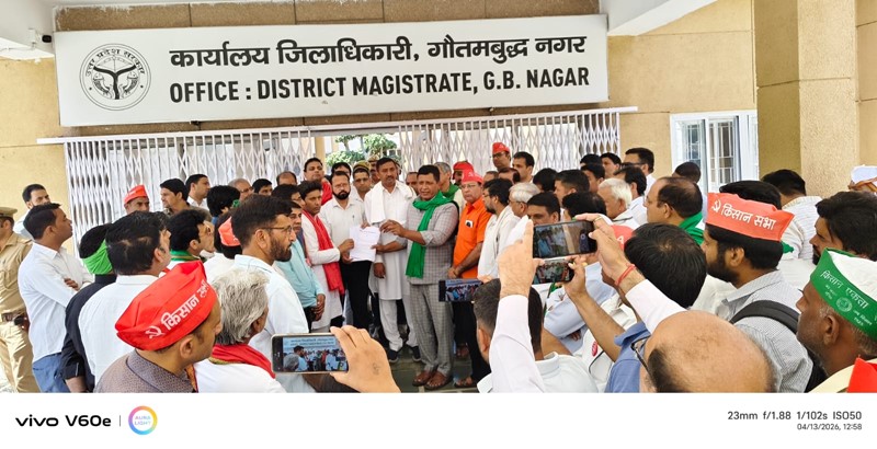 Greater Noida News (13/04/2026): किसान नेताओं की कथित अवैध नजरबंदी के विरोध में सोमवार को गौतमबुद्ध नगर में किसान संगठनों ने जोरदार प्रदर्शन किया। किसान संघर्ष मोर्चा के बैनर तले आयोजित इस विरोध प्रदर्शन में सैकड़ों किसान और कार्यकर्ता शामिल हुए। प्रदर्शन के दौरान किसानों ने जिलाधिकारी और पुलिस कमिश्नर को ज्ञापन सौंपकर कार्रवाई की मांग की।