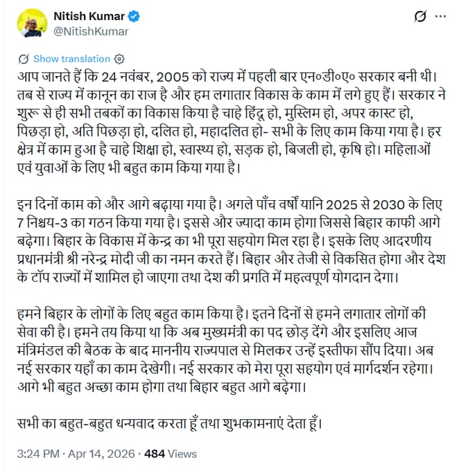 Bihar News (14 April 2026): नीतीश कुमार ने एक महत्वपूर्ण राजनीतिक फैसला लेते हुए मुख्यमंत्री पद से इस्तीफा देने की घोषणा कर दी है। सोशल मीडिया पर जारी बयान में उन्होंने बताया कि, राज्यपाल से मिलकर अपना इस्तीफा सौंप दिया है। इस घोषणा के बाद बिहार की राजनीति में हलचल तेज हो गई है और नई सरकार के गठन को लेकर चर्चाएं शुरू हो गई हैं।