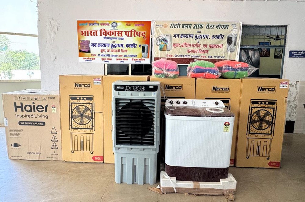 Greater Noida News (20/04/ 2026): रोटरी क्लब ग्रेटर नोएडा और भारत विकास परिषद, गौतमबुद्ध नगर शाखा के संयुक्त तत्वावधान में दनकौर स्थित जन कल्याण वृद्धाश्रम में रह रहे बुजुर्गों के लिए संस्था ने 1 वाशिंग मशीन और 6 कूलर भेंट किए।