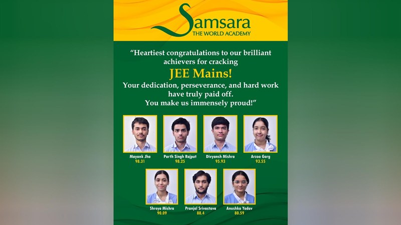 Greater Noida News (23/04/2026): ग्रेटर नोएडा के समसारा विद्यालय के विद्यार्थियों ने जेईई मेंस परीक्षा (JEE Mains Exam) में उत्कृष्ट प्रदर्शन किया। इसमें मयंक झा ने 98.31 परसेंटाइल, पार्थ सिंह राजपूत ने 98.25 परसेंटाइल और दिव्यांश मिश्रा ने 95.93 परसेंटाइल प्राप्त कर शानदार सफलता हासिल की।
