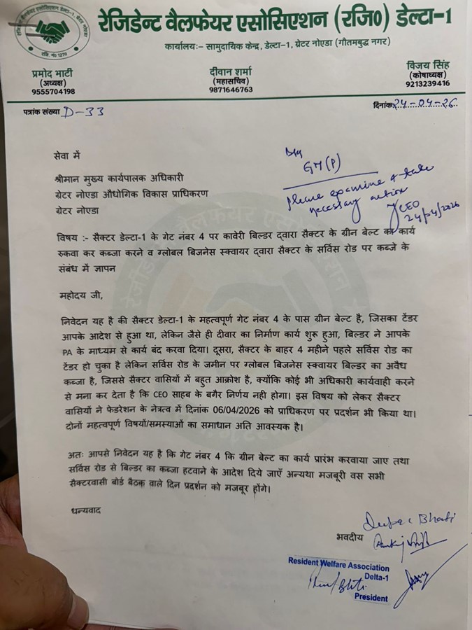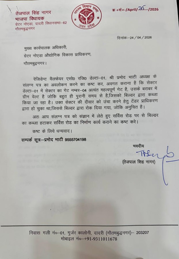 Greater Noida News (24/04/2026): आज 24 अप्रैल को आरडब्ल्यूए डेल्टा-01 का एक प्रतिनिधिमंडल, फेडरेशन के पूर्व महासचिव दीपक कुमार भाटी के नेतृत्व में, सेक्टर की ग्रीन बेल्ट पर कावेरी बिल्डर द्वारा किए गए कब्जे तथा ग्लोबल बिजनेस स्क्वेयर द्वारा सर्विस रोड पर किए गए अतिक्रमण की शिकायत को लेकर दादरी विधायक तेजपाल नागर से मिला।