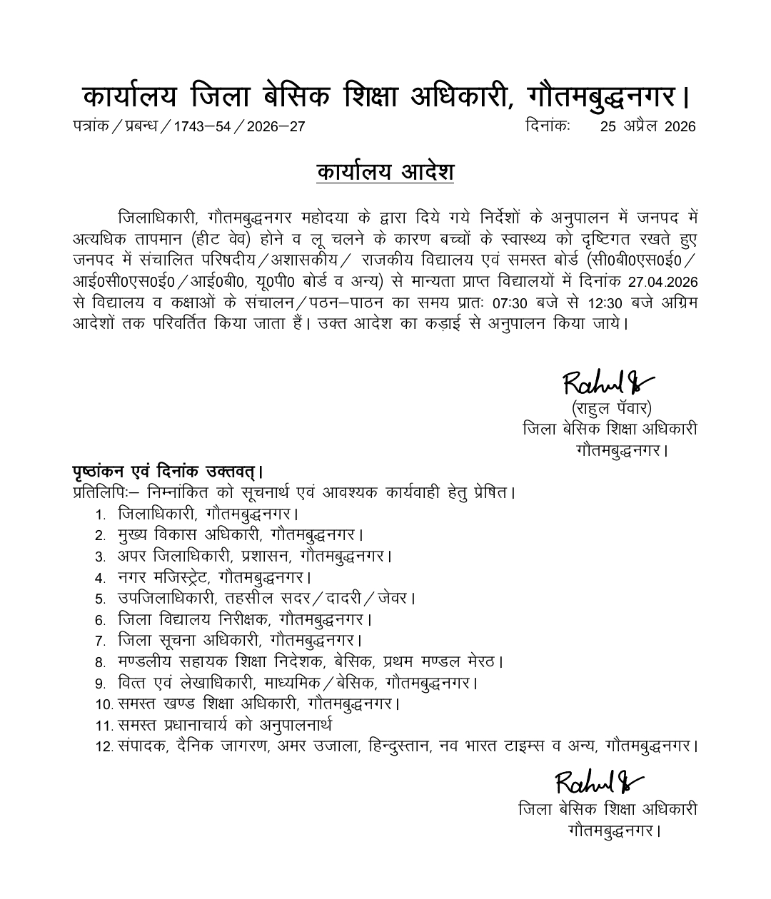 Gautam Buddh Nagar News (27/04/2026): गौतमबुद्ध नगर जिले में बढ़ती गर्मी और लू (Heat Wave) को देखते हुए बच्चों की सुरक्षा के लिए स्कूलों के समय (School Timing Changes) में बदलाव किया है। इसके बाद सभी स्कूलों में अब सुबह 7:30 से दोपहर 12:30 बजे तक कक्षाएं चलेगी।