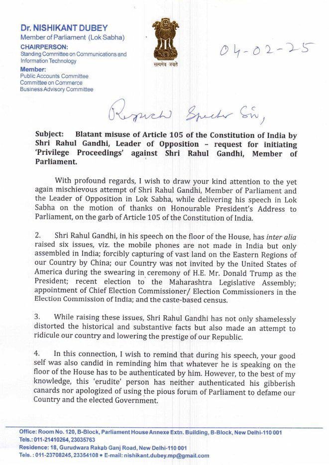 निशिकांत दुबे ने अपने पत्र में कहा कि राहुल गांधी ने राष्ट्रपति के अभिभाषण पर धन्यवाद प्रस्ताव के दौरान छह प्रमुख मुद्दों पर चर्चा की, जिनमें शामिल हैं:
