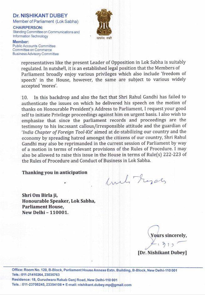 भाजपा सांसद ने कहा कि इन सभी मुद्दों पर राहुल गांधी ने झूठ फैलाया और बिना प्रमाण संसद में गलत तथ्य प्रस्तुत किए । निशिकांत दुबे ने पत्र में लिखा कि राहुल गांधी ने संसद में दिए गए अपने भाषण को प्रमाणित नहीं किया, न ही अपनी बातों का कोई सबूत दिया। उन्होंने आरोप लगाया कि विपक्ष के नेता ने जानबूझकर भारत की लोकतांत्रिक व्यवस्था और सरकार की छवि खराब करने की कोशिश की।