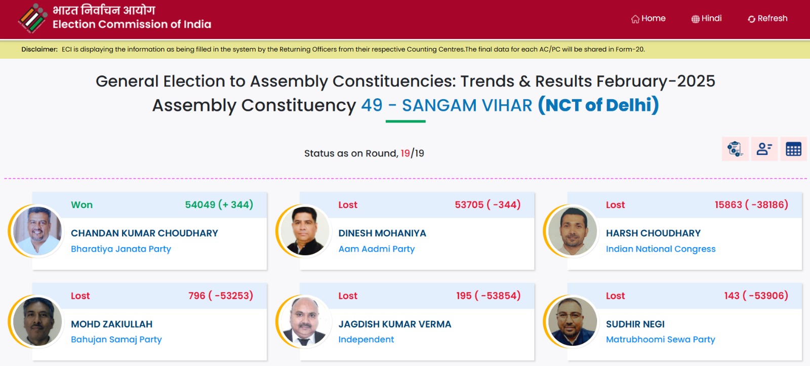 नई दिल्ली (8 फरवरी 2025): दिल्ली विधानसभा चुनाव 2025 में संगम विहार सीट पर भारतीय जनता पार्टी (भा.ज.पा.) के उम्मीदवार चंदन कुमार चौधरी ने आम आदमी पार्टी (आप) के दिग्गज और तीन बार के विधायक दिनेश मोहनिया को हराकर एक अहम जीत हासिल की। चंदन कुमार चौधरी ने कुल 54,049 वोट प्राप्त किए, जबकि दिनेश मोहनिया को 53,705 वोट मिले। इस चुनाव में कांग्रेस के उम्मीदवार हर्ष चौधरी को केवल 15,863 वोट मिले और वे तीसरे स्थान पर रहे।