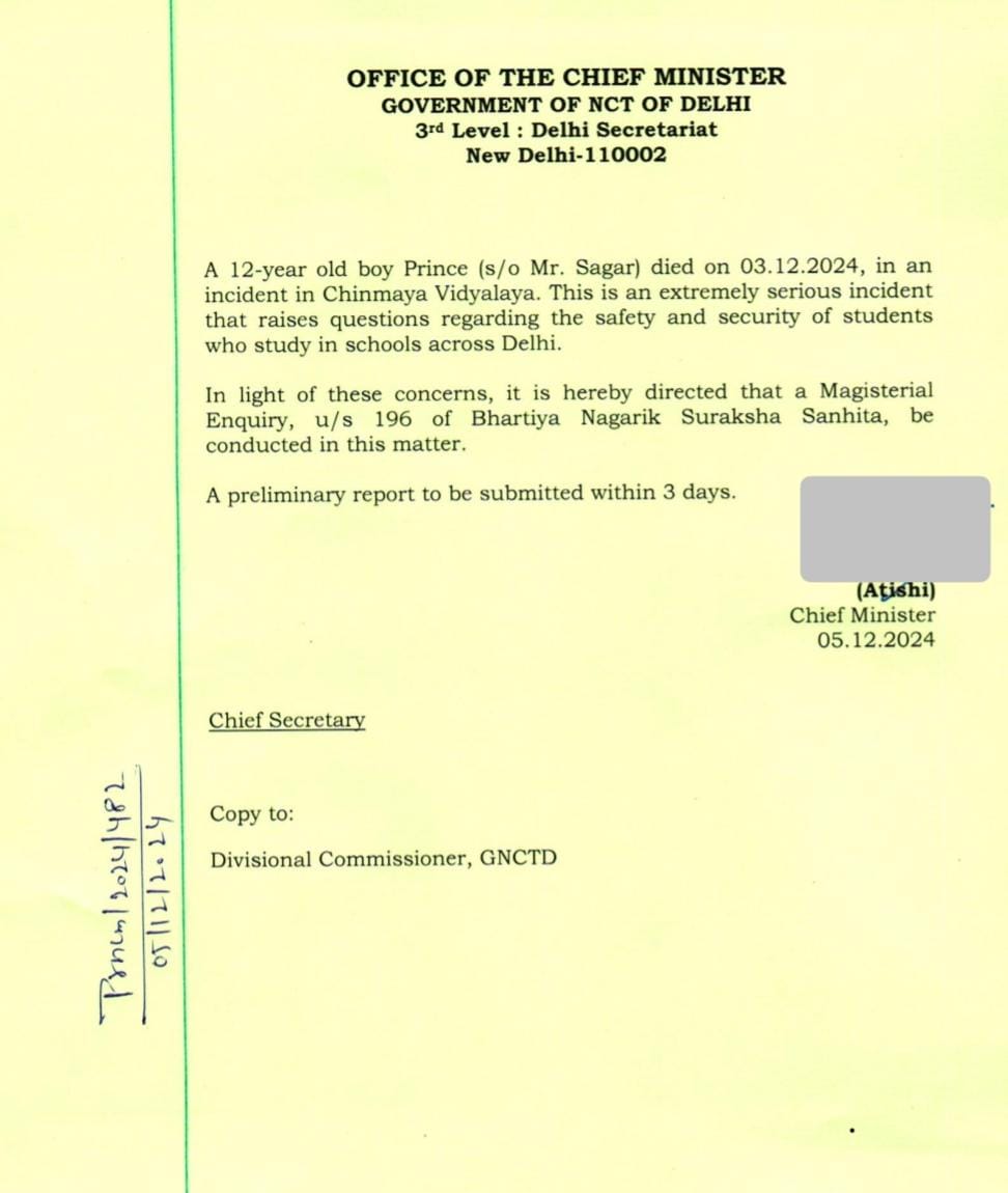 मुख्यमंत्री ने मुख्य सचिव को तीन दिन के भीतर मजिस्ट्रियल जांच रिपोर्ट (magisterial inquiry report) सौंपने के निर्देश दिए हैं। उन्होंने कहा कि यह घटना दिल्ली के स्कूलों में बच्चों की सुरक्षा (student safety) पर सवाल खड़े करती है। सरकार यह सुनिश्चित करेगी (ensure) कि भविष्य में ऐसी घटनाएं न हों।