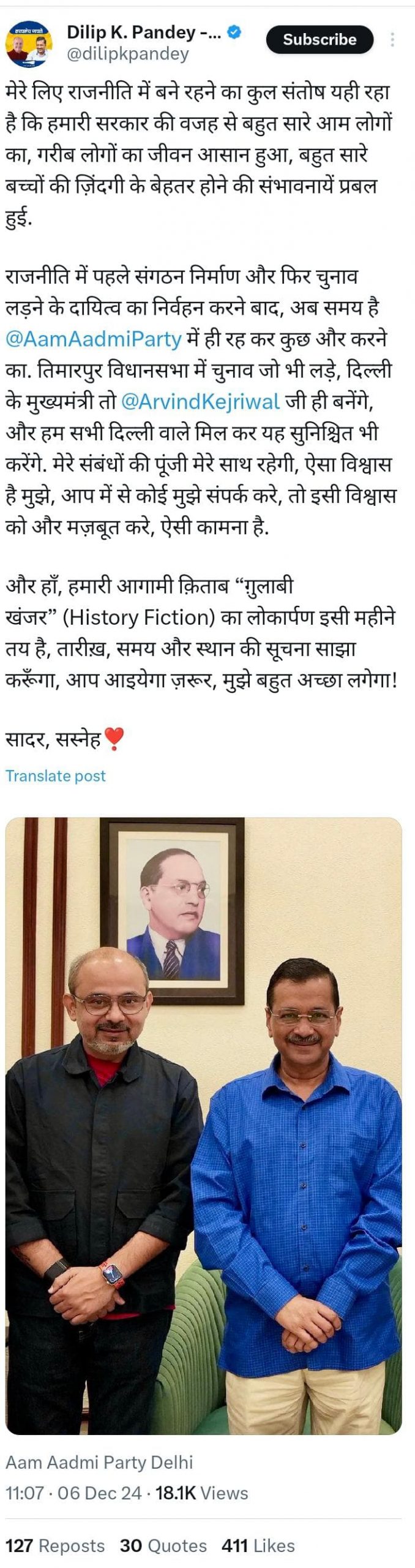 राजनीतिक घोषणा के साथ ही उन्होंने अपनी आगामी पुस्तक ‘गुलाबी खंजर’ का जिक्र भी किया। यह एक ‘हिस्ट्री फिक्शन’ है, जिसका लोकार्पण इसी महीने होना है। तारीख, समय और स्थान की जानकारी जल्द साझा करने की बात कहते हुए उन्होंने लोगों को इस कार्यक्रम में शामिल होने का निमंत्रण दिया।