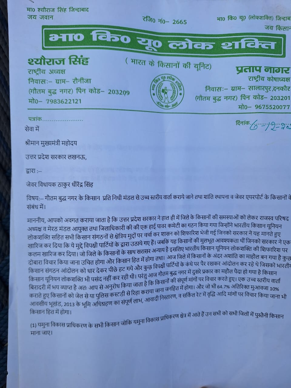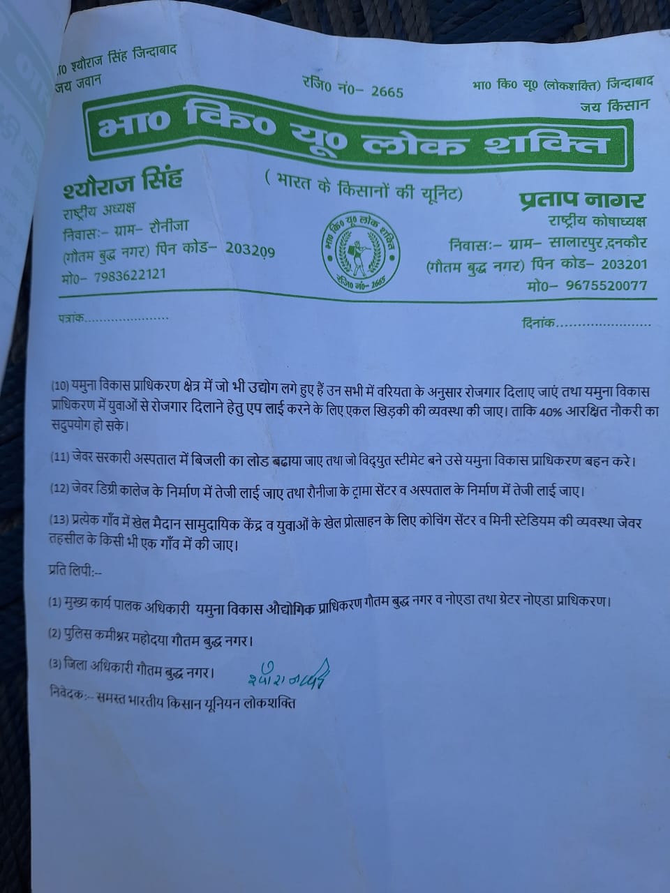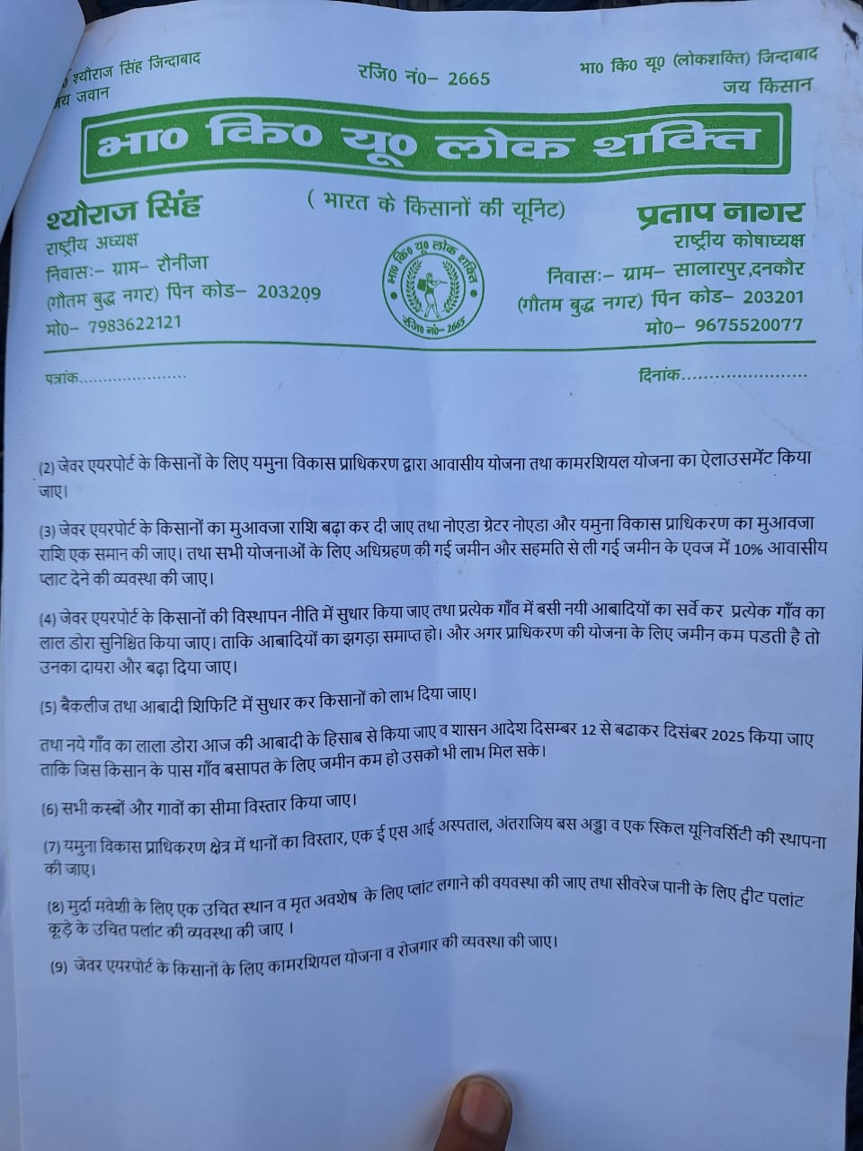 3. जेवर एयरपोर्ट मुआवजा: एयरपोर्ट के लिए अधिग्रहीत भूमि के लिए मुआवजा राशि को बढ़ाया जाए और नोएडा, ग्रेटर नोएडा तथा यमुना प्राधिकरण के मुआवजे को समान किया जाए।