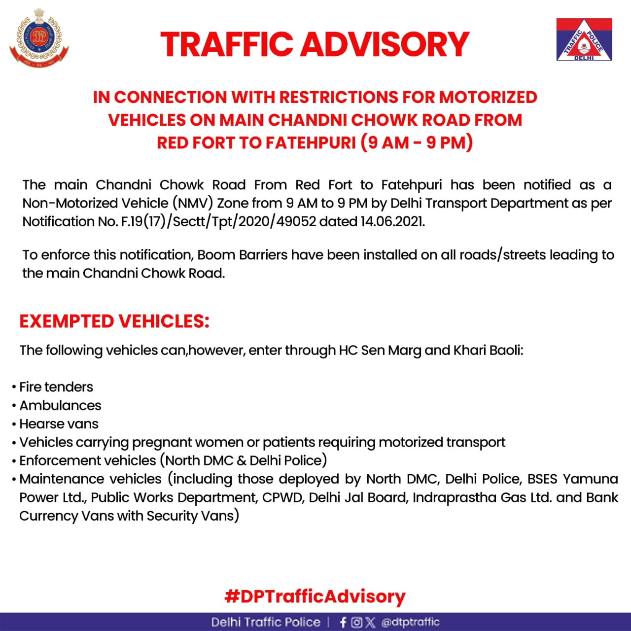 ट्रैफिक पुलिस की एडवाइजरी के अनुसार, यह प्रतिबंध सुबह 9 बजे से रात 9 बजे तक लागू रहेगा। दिल्ली परिवहन विभाग ने इस क्षेत्र को गैर-मोटर चालित वाहन (NMV) क्षेत्र के रूप में अधिसूचित किया है, जिससे इस दौरान केवल पैदल यात्रियों और साइकिल सवारों को ही प्रवेश की अनुमति होगी। इस आदेश को सख्ती से लागू करने के लिए पुलिस ने मुख्य चांदनी चौक रोड से जुड़ी सभी गलियों और सड़कों पर बूम बैरियर लगाए हैं। यह कदम सुनिश्चित करेगा कि कोई भी मोटर चालित वाहन इस प्रतिबंधित मार्ग पर प्रवेश न कर सके।
