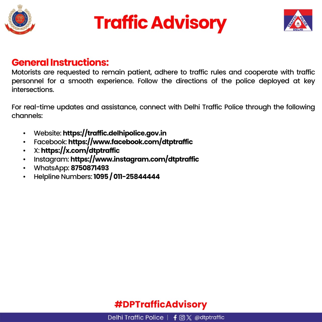 दिल्ली ट्रैफिक पुलिस ने नागरिकों से अनुरोध किया है कि वे धैर्य बनाए रखें, ट्रैफिक नियमों का पालन करें और सुगम यात्रा के लिए पुलिस कर्मियों के साथ सहयोग करें। साथ ही, पुलिस ने मोटर चालकों को वैकल्पिक मार्गों का उपयोग करने की सलाह दी है ताकि किसी भी तरह की असुविधा से बचा जा सके।