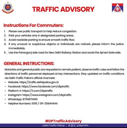 यात्रियों को सलाह दी गई है कि वे सार्वजनिक परिवहन का अधिक से अधिक उपयोग करें और अपने वाहनों को केवल निर्धारित पार्किंग स्थलों पर ही खड़ा करें। सड़क किनारे पार्किंग से बचें और सुचारू यातायात बनाए रखने में सहयोग करें। किसी भी संदिग्ध वस्तु या व्यक्ति को देखने पर तुरंत पुलिस को सूचित करने का निर्देश दिया गया है। वहीं, नई दिल्ली रेलवे स्टेशन जाने वाले यात्रियों को पहाड़गंज साइड रोड का इस्तेमाल करने और अजमेरी गेट साइड से बचने की सलाह दी गई है।