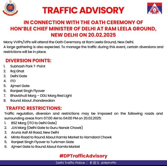 नई दिल्ली, (19 फरवरी 2025): दिल्ली के नए मुख्यमंत्री के शपथ ग्रहण समारोह को देखते हुए राजधानी में ट्रैफिक पुलिस ने विशेष एडवाइजरी जारी की है। 20 फरवरी को रामलीला मैदान में आयोजित इस समारोह में कई वीवीआईपी और हजारों लोग शामिल होंगे, जिससे यातायात प्रभावित होने की संभावना है। इसी को ध्यान में रखते हुए कई मार्गों पर डायवर्जन और प्रतिबंध लागू किए गए हैं।