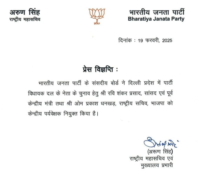 नई दिल्ली (19 फरवरी 2025): भारतीय जनता पार्टी ने वरिष्ठ नेता रविशंकर प्रसाद और पार्टी के राष्ट्रीय सचिव ओम प्रकाश धनखड़ को दिल्ली भाजपा विधायक दल का नेता चुनने के लिए केंद्रीय पर्यवेक्षक नियुक्त किया है। इस महत्वपूर्ण निर्णय से दिल्ली की राजनीति में हलचल बढ़ गई है।।