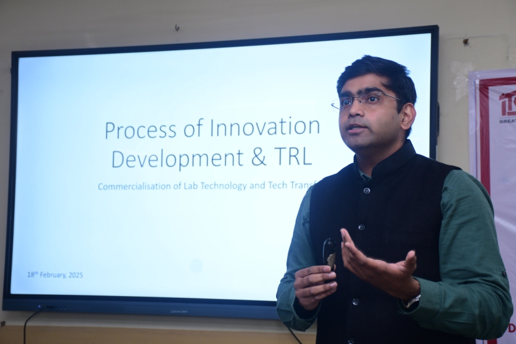 अपने मुख्य भाषण में, डॉ. रजत मिश्रा ने Technology Readiness Levels (TRL) के महत्व को समझाया और बताया कि यह किसी भी तकनीक की परिपक्वता का आकलन करने के लिए एक मानक उपकरण है। उन्होंने बताया कि कैसे शैक्षणिक नवाचारों को सफलतापूर्वक व्यावसायिक उपक्रमों में बदला जा सकता है। उन्होंने टेक-ट्रांसफर प्रक्रिया से जुड़ी चुनौतियों और अवसरों पर भी चर्चा की और कई व्यावहारिक उदाहरणों और केस स्टडीज के माध्यम से विषय को रोचक बनाया। डॉ. मिश्रा ने उद्योग, शिक्षा और सरकारी सहयोग की आवश्यकता पर बल देते हुए बताया कि कैसे अनुसंधान को व्यावसायिक सफलता में बदला जा सकता है। उन्होंने नवाचार की व्यावसायिक प्रक्रिया की जटिलताओं को समझाने के साथ-साथ इसकी संभावनाओं पर भी प्रकाश डाला।