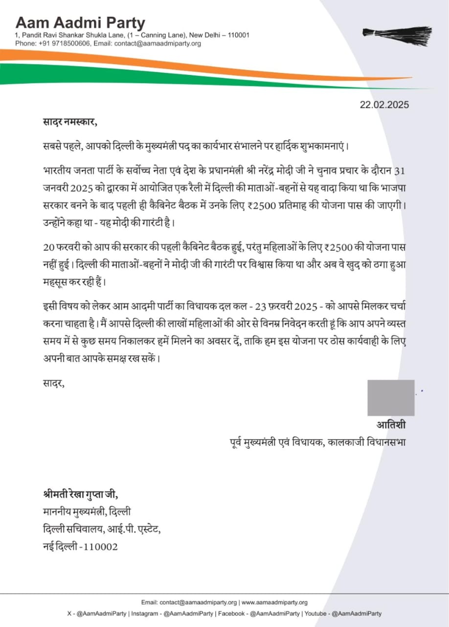 नई दिल्ली (22 फरवरी, 2025): दिल्ली की पूर्व मुख्यमंत्री और आम आदमी पार्टी (AAP) की वरिष्ठ नेता आतिशी ने मुख्यमंत्री रेखा गुप्ता को पत्र लिखकर 2500 रुपये प्रतिमाह महिलाओं को देने से जुड़ी योजना पर चर्चा के लिए समय मांगा है। उन्होंने 23 फरवरी को आम आदमी पार्टी के विधायक दल के साथ मुख्यमंत्री से मुलाकात करने की मांग की है।