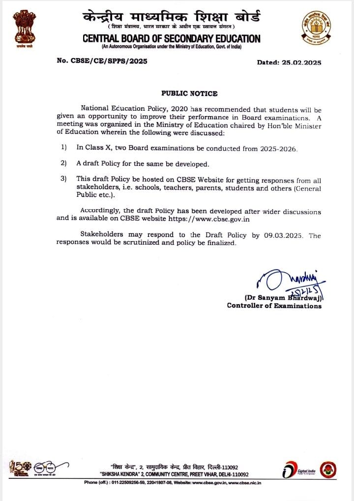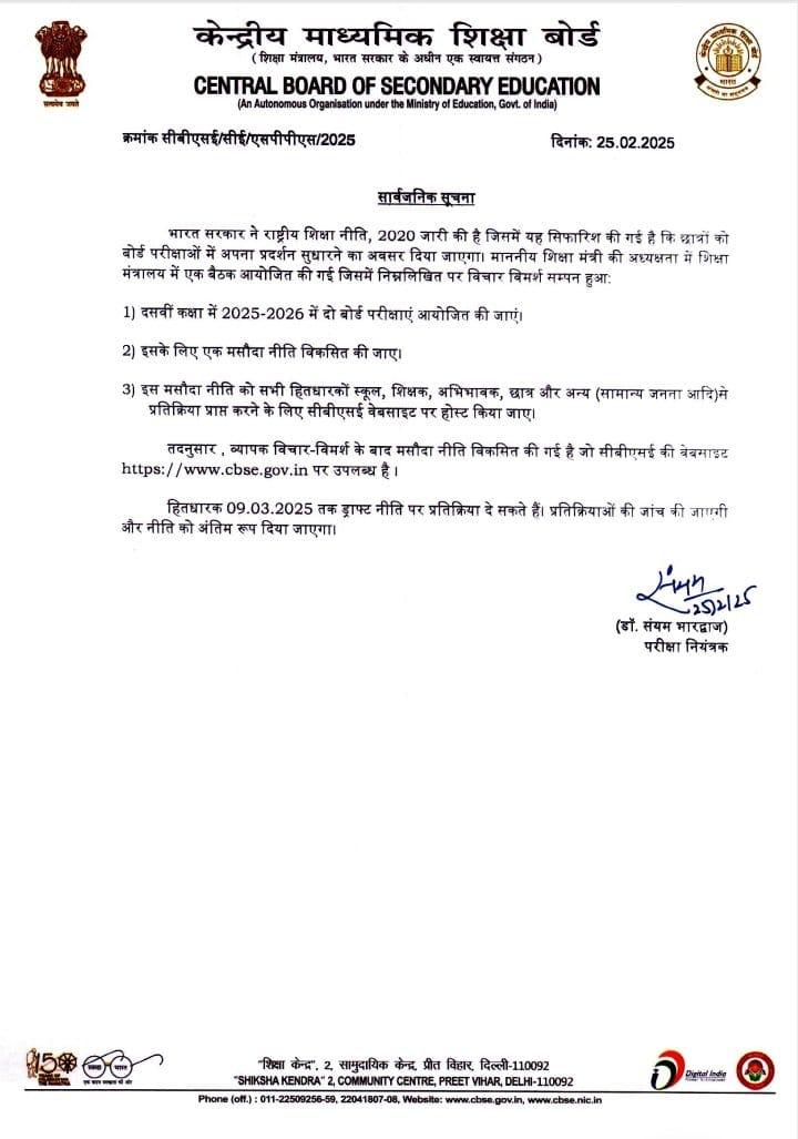 नई दिल्ली (26 फरवरी 2025): केंद्रीय माध्यमिक शिक्षा बोर्ड (CBSE) ने परीक्षा प्रणाली में बड़ा बदलाव करते हुए वर्ष 2026 से कक्षा 10वीं की बोर्ड परीक्षा साल में दो बार आयोजित करने का फैसला किया है। इस नए नियम के तहत, छात्रों को परीक्षा के दो अवसर मिलेंगे, जिससे वे अपने प्रदर्शन में सुधार कर सकेंगे। इस प्रस्तावित नीति का उद्देश्य परीक्षा के दबाव को कम करना और छात्रों को अधिक लचीलेपन के साथ सीखने का अवसर देना है।