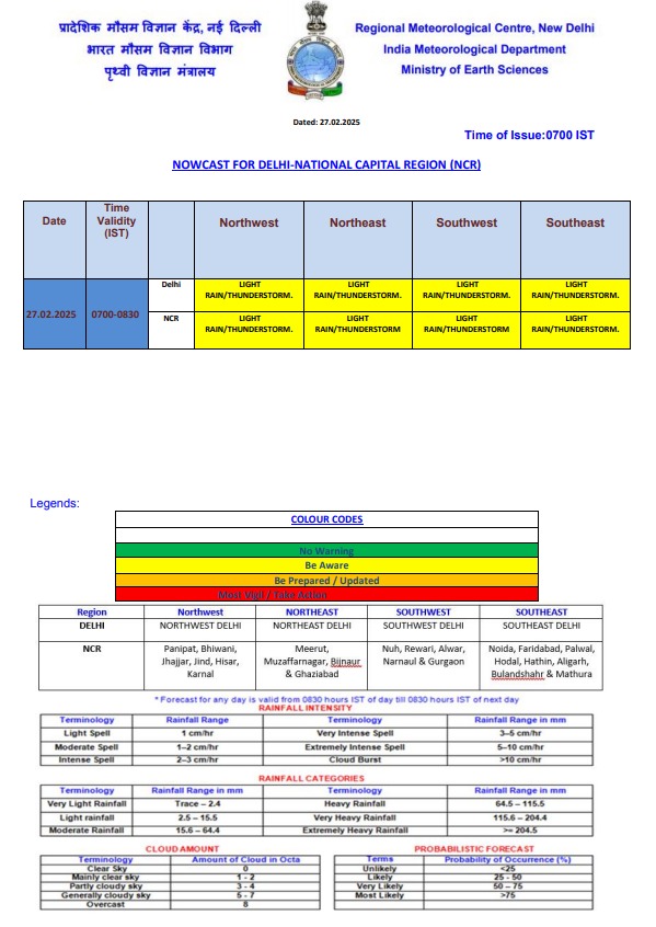 नई दिल्ली (27 फरवरी, 2025): भारतीय मौसम विभाग ने आज दिल्ली NCR समेत उत्तर भारत के कई हिस्सों में बारिश का पूर्वानुमान जताया है। मौसम विभाग के मुताबिक, एक पश्चिमी विक्षोभ के सक्रिय होने की वजह से दिल्ली और उसके आसपास के इलाकों में हल्की से मध्यम बारिश हो सकती है। यह बारिश खासकर आज सुबह और शाम के समय हो सकती है।