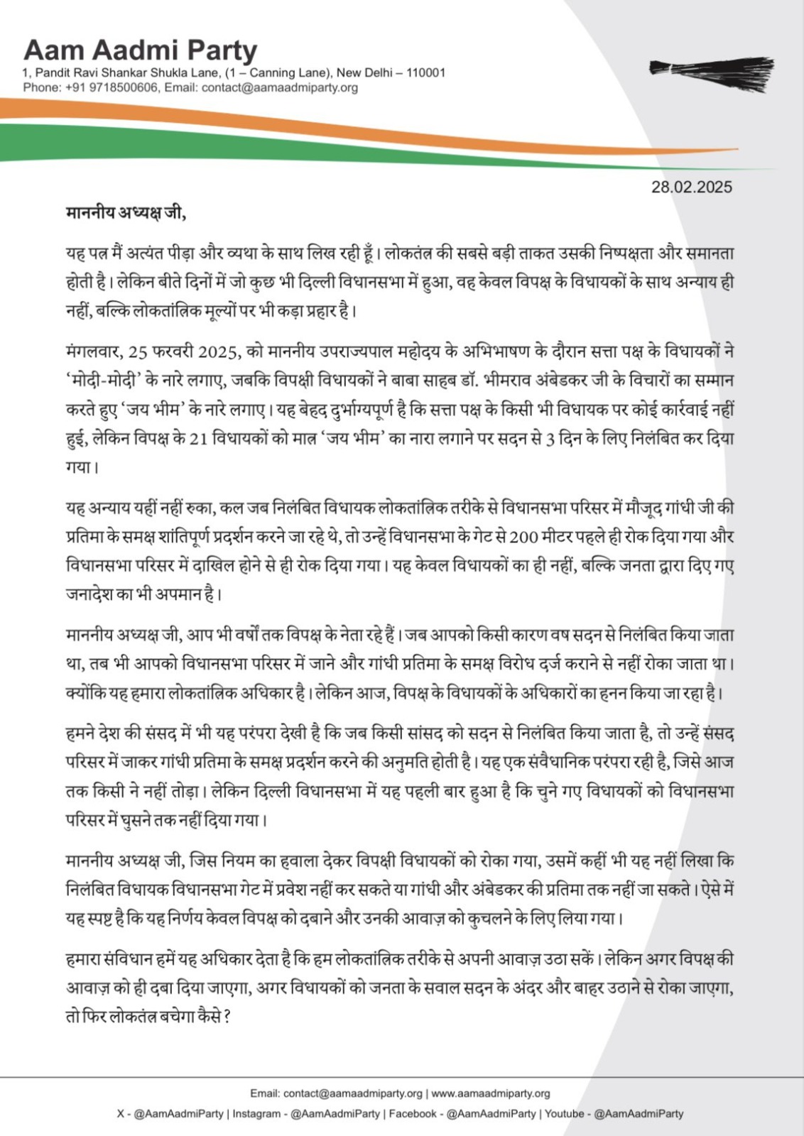 आतिशी ने अपने पत्र में लिखा कि 25 फरवरी 2025 को उपराज्यपाल के अभिभाषण के दौरान सत्ता पक्ष के विधायकों ने “मोदी-मोदी” और “जय श्री राम” के नारे लगाए, लेकिन जब विपक्ष ने विरोध में “जय भीम” के नारे लगाए, तो 21 विधायकों को तीन दिन के लिए निलंबित कर दिया गया। उन्होंने इसे लोकतांत्रिक परंपराओं पर हमला करार दिया और कहा कि यह केवल विपक्ष के साथ अन्याय नहीं, बल्कि लोकतंत्र की मूल भावनाओं पर भी आघात है।