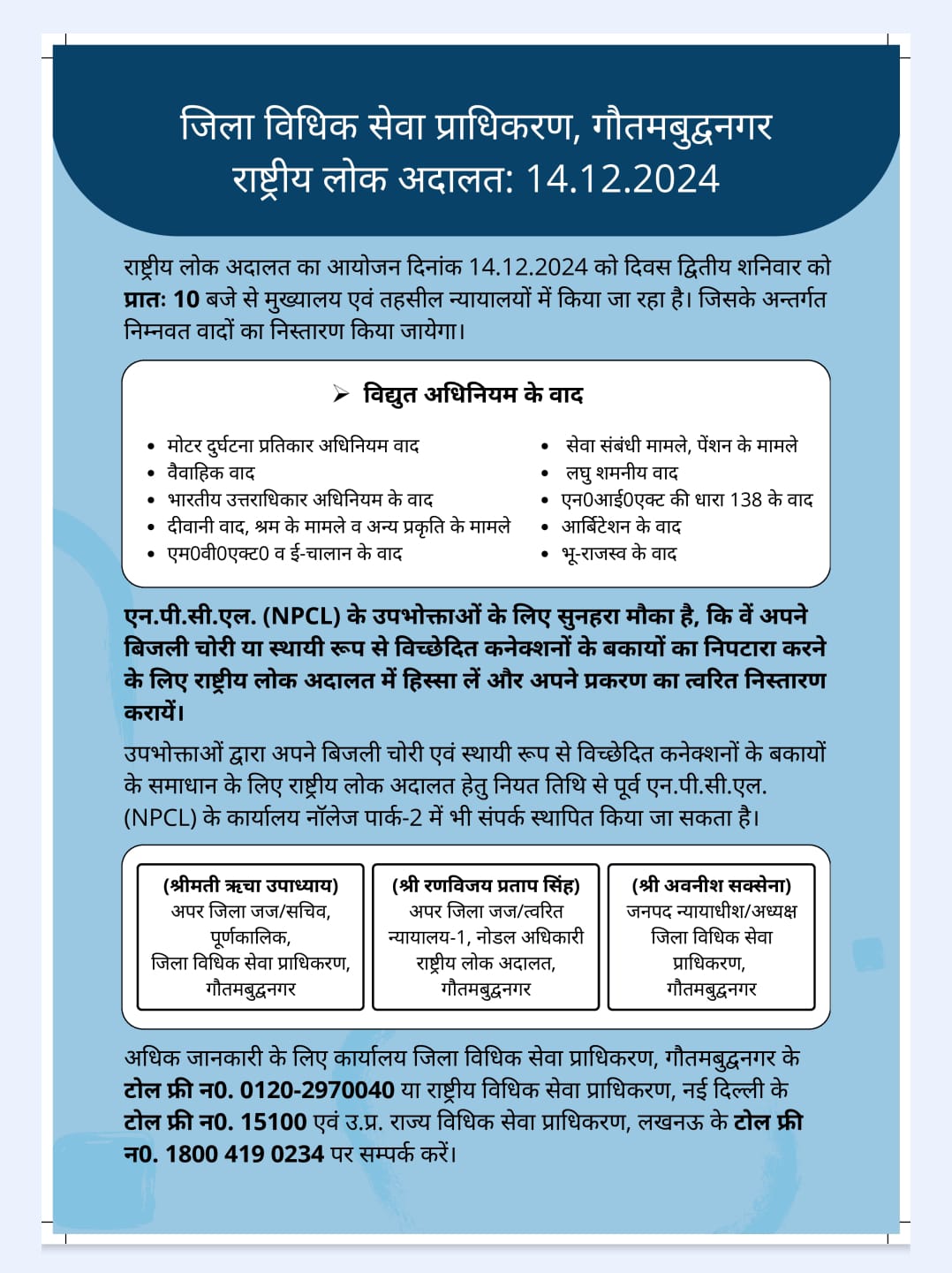 बिजली विभाग ने इस मामले को गंभीरता से लेते हुए राष्ट्रीय लोक अदालत में इसे दर्ज कराया। अदालत ने संदीप भाटी को नोटिस भेजते हुए कहा है कि 14 दिसंबर को आयोजित लोक अदालत में उपस्थित होकर बकाया राशि का भुगतान करें। राष्ट्रीय लोक अदालत में समझौते के जरिए विवादों का निपटारा किया जाता है। इस मामले में भी आरडब्ल्यूए अध्यक्ष को मौका दिया गया है कि वे बकाया राशि का भुगतान कर विवाद को समाप्त कर सकते हैं। समझौते के तहत अदायगी करने पर कानूनी कार्रवाई से बचा जा सकता है।